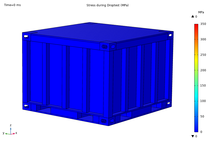 When containers drop there will be a free fall ending in a sudden impact when it hits the ground for example. Depending on the content of the container strict regulations may apply on the strength on the container and thus also drop tests. In this case the content was a light toxic material, and Physixfactor performed a droptest accoding the specification of the customer. On the left the vibrations and stress development is depicted just after impact.