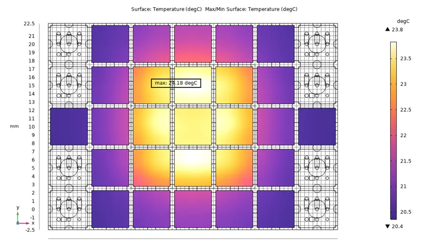 A MEMS (Micro-Electro-Mechanical System) can be embedded in a semiconductor structure to establish the resonance frequency of a device. The structure on the right is a broad view of the thermal behavior of such a structure of a complex application with many chip components.